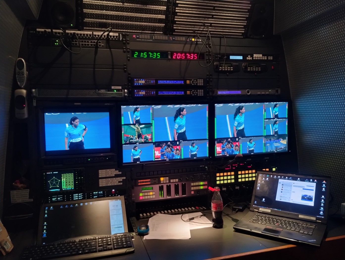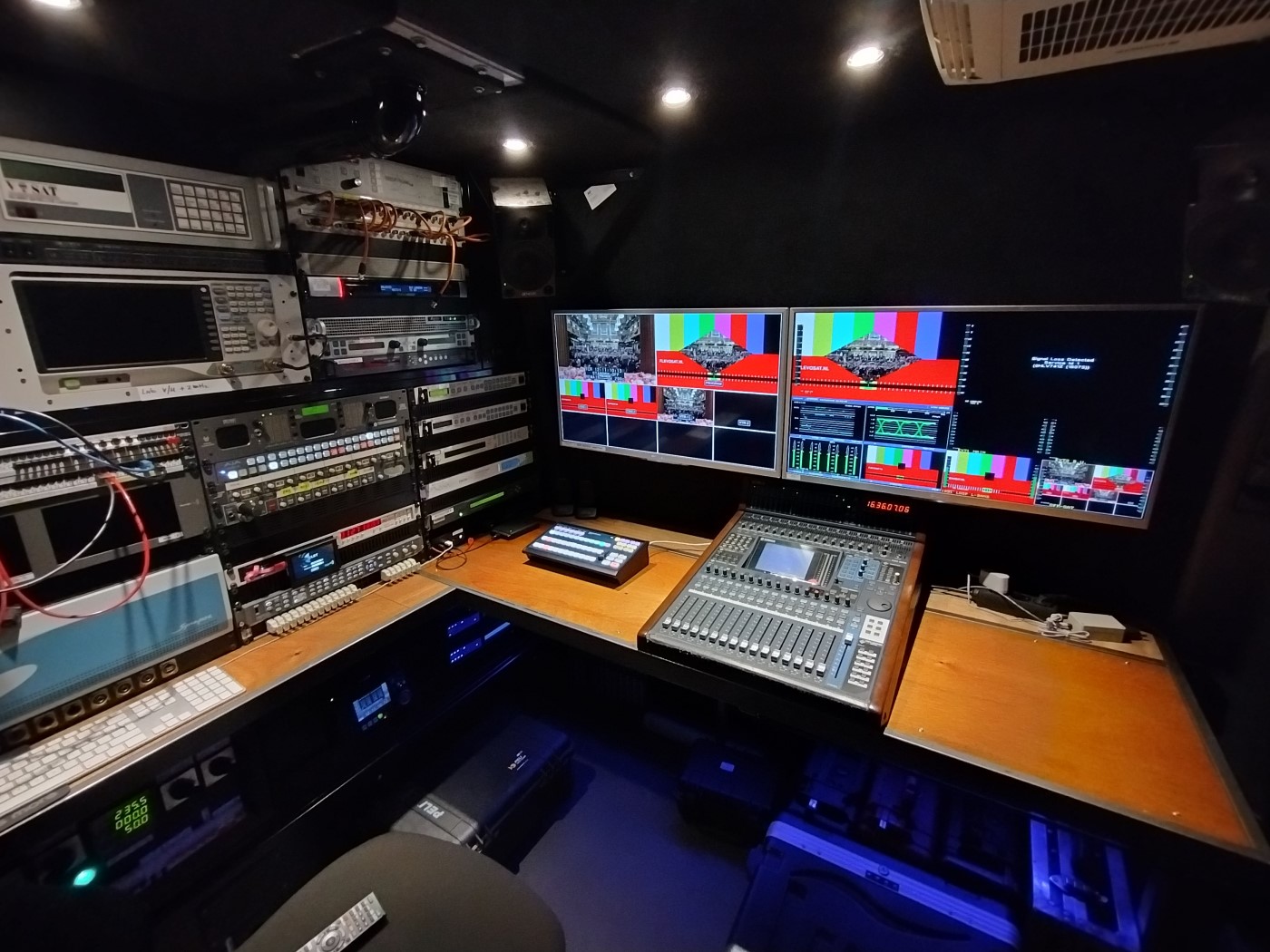 Flevosat | Satellite Broadcasting - General information SNG-1 - General information SNG-2 - SNG-1, inside view. - SNG-2 - SNG-2, inside view desk. - SNG-2, inside view uplink. - SNG-1, with our external (silent) 10KVA electronically stabilized generator.             Both the SNG-1 and SNG-2 have a built-in PTO driven backup generator.